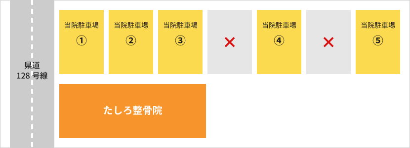 図の通り県道128号線側から4台目は当院の駐車場ではありませんのでご注意ください。